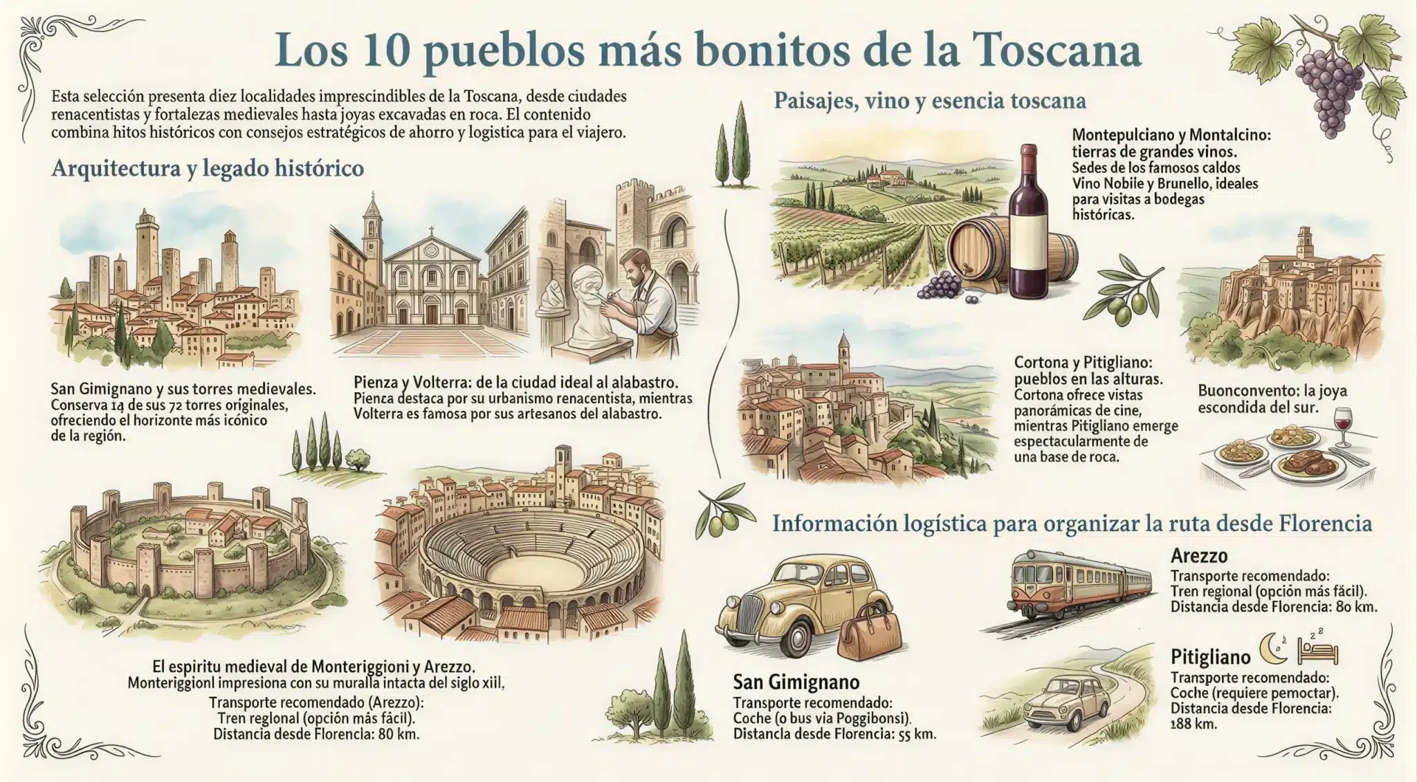 | Pueblo | Transporte recomendado | Distancia/tiempo desde Florencia (aprox.) | A tener en cuenta |